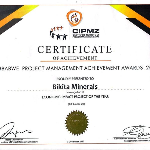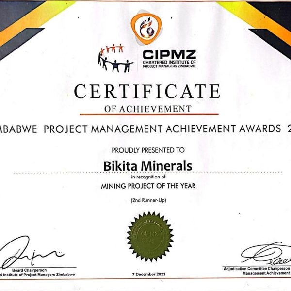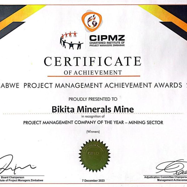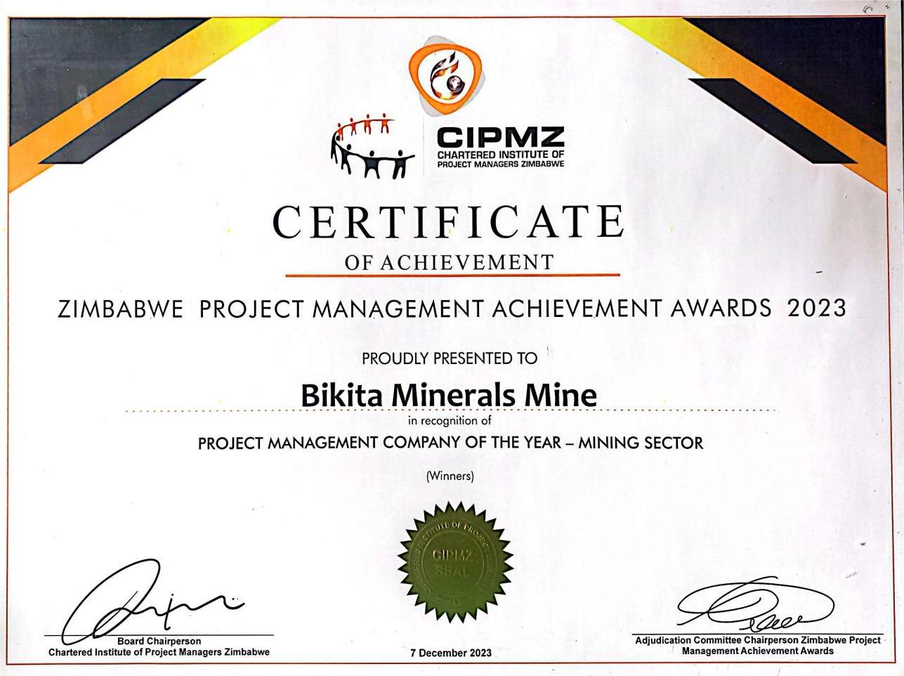 Zimbabwe Project Management Achievement Award for 2023 for Project Management company of the year in the mining sector