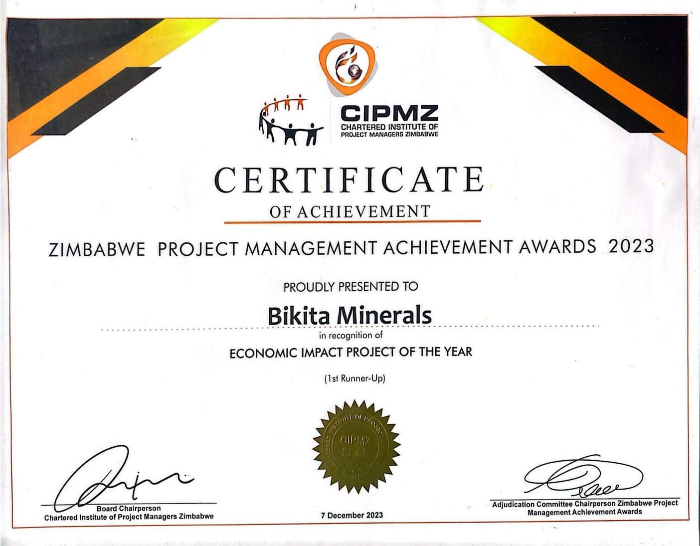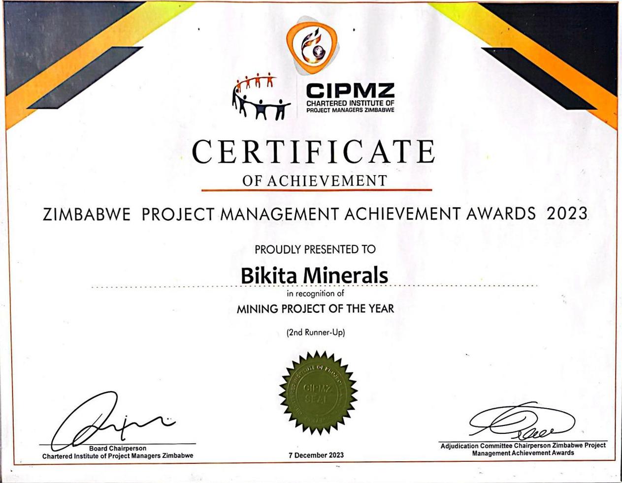 Zimbabwe Project Management Achievement Award for 2023 for the best Mining Project of the Year
