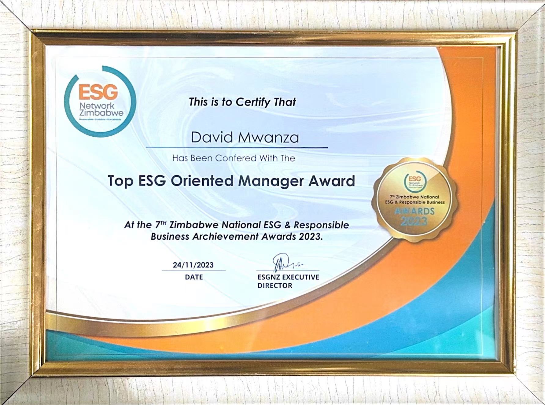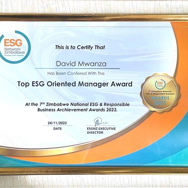 Top ESG Oriented Manager Award at the 7th Zimbabwe National ESG & Responsible Business Achievement Awards 2023