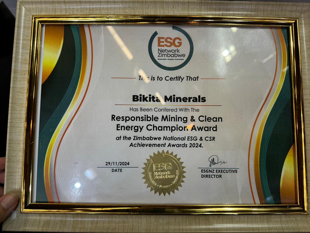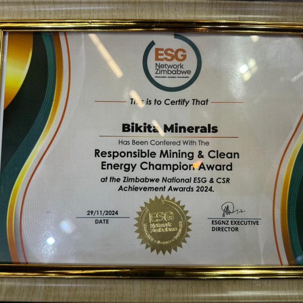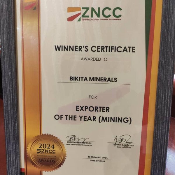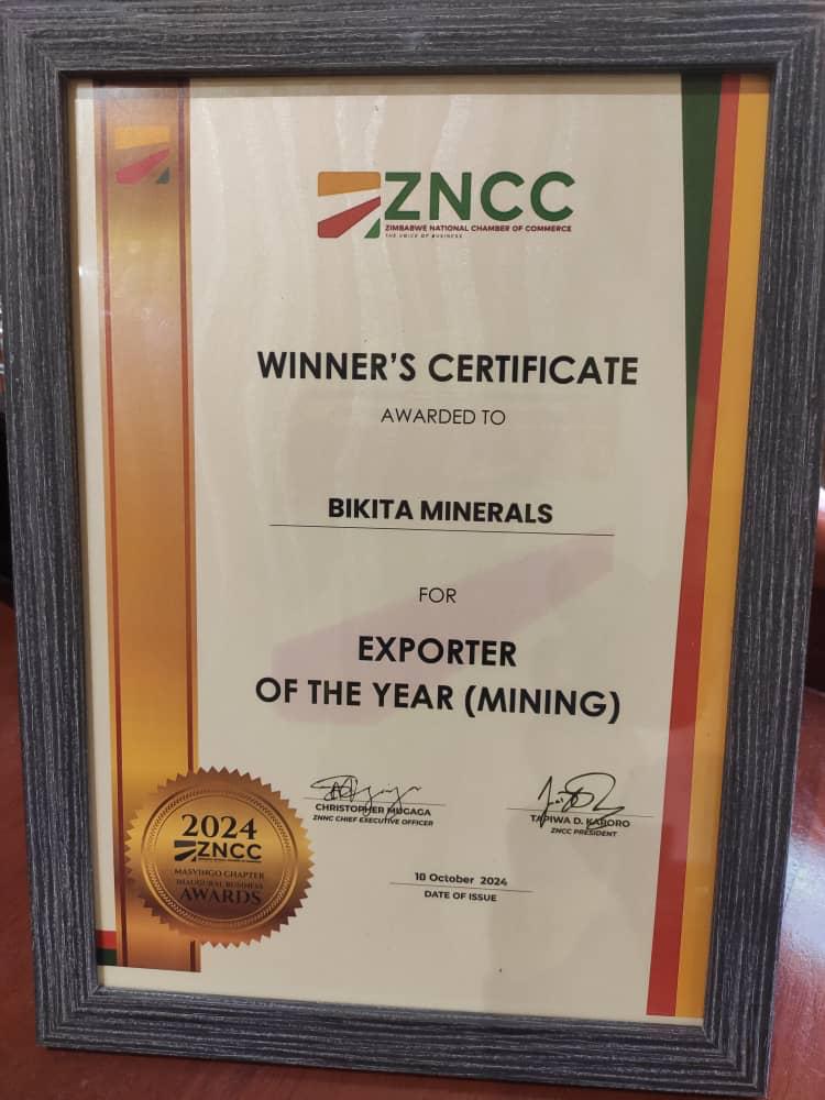 ZNCC Certificate Award for best Mining Exporter of the Year in 2024